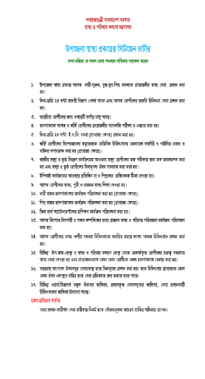 উপজেলা স্বাস্থ্য প্রকল্পের সিটিজেন চার্টার সেবা গ্রহিতা যে সকল সেবা পাওয়ার অধিকার সংরক্ষণ করেন ১. উপজেলা স্বাস্থ্য প্রকল্পে আগত নারী-পুরুষ, বৃদ্ধ-যুব-শিশু সকলকে প্রয়োজনীয় স্বাস্থ্য সেবা প্রদান করা হয়। ২. দিবা-রাত্রি ২৪ ঘণ্টা জরুরী বিভাগ খোলা থাকে এবং আগত